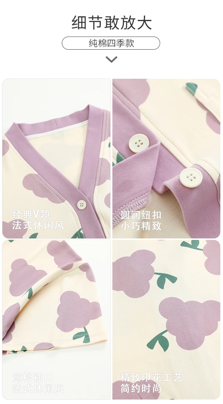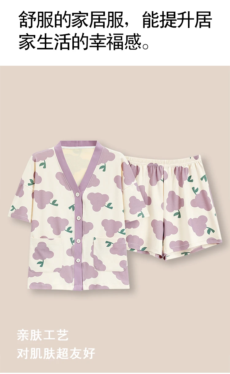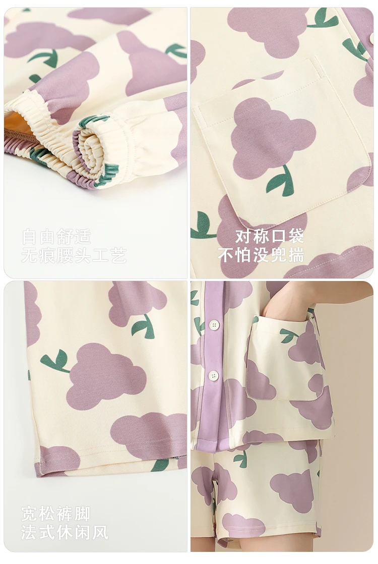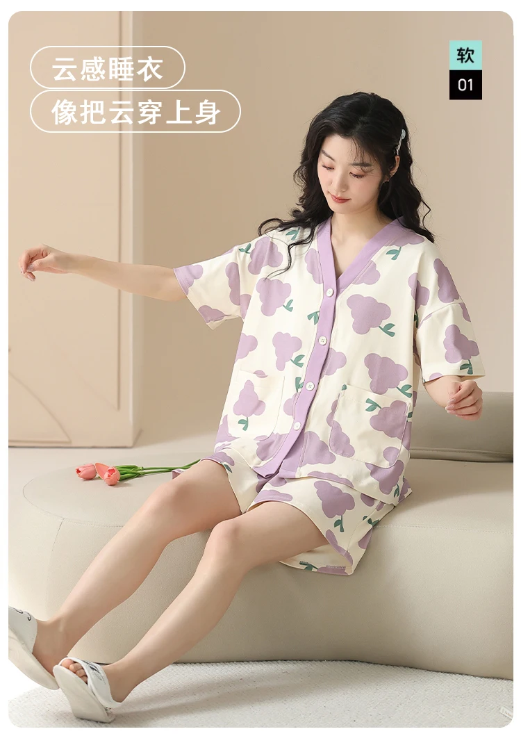 Women Pajama Set Summer 100%Cotton Short Sleeve Sleepwear V-Neck Floral Pijama