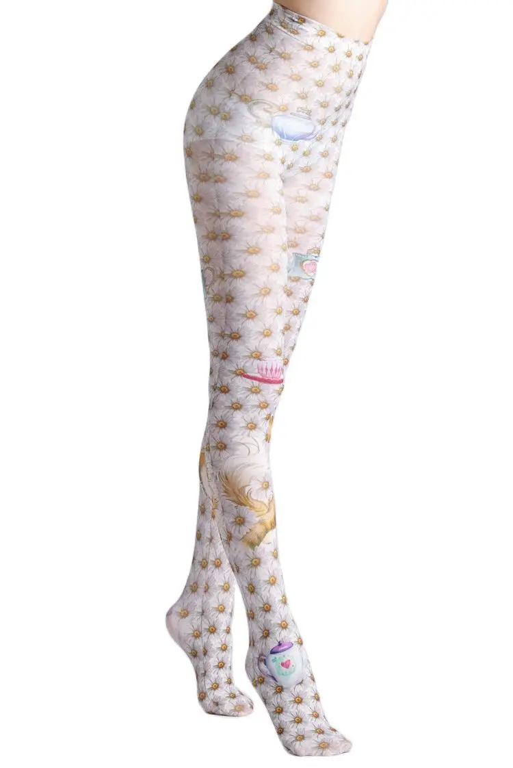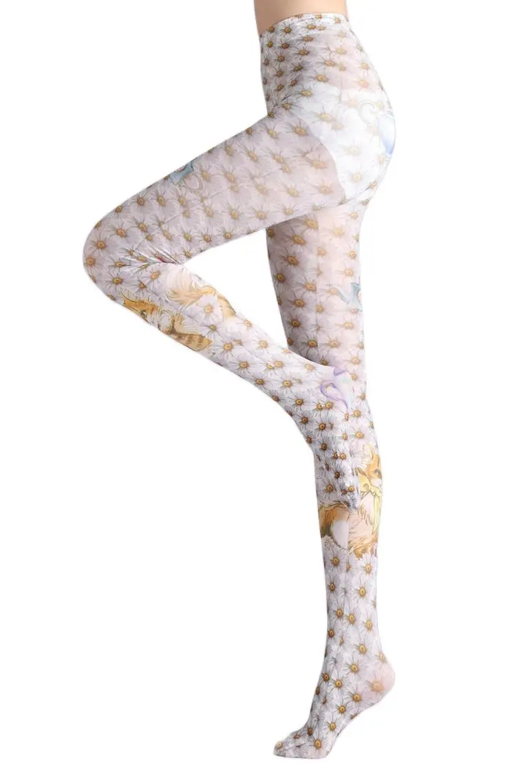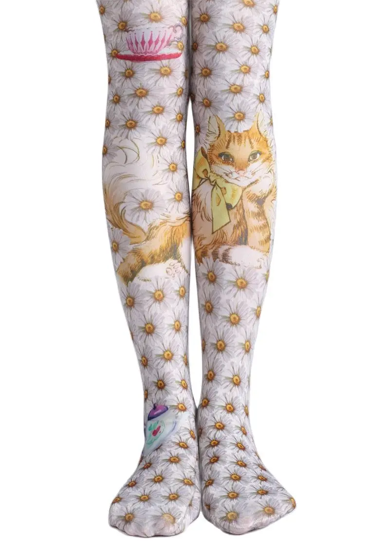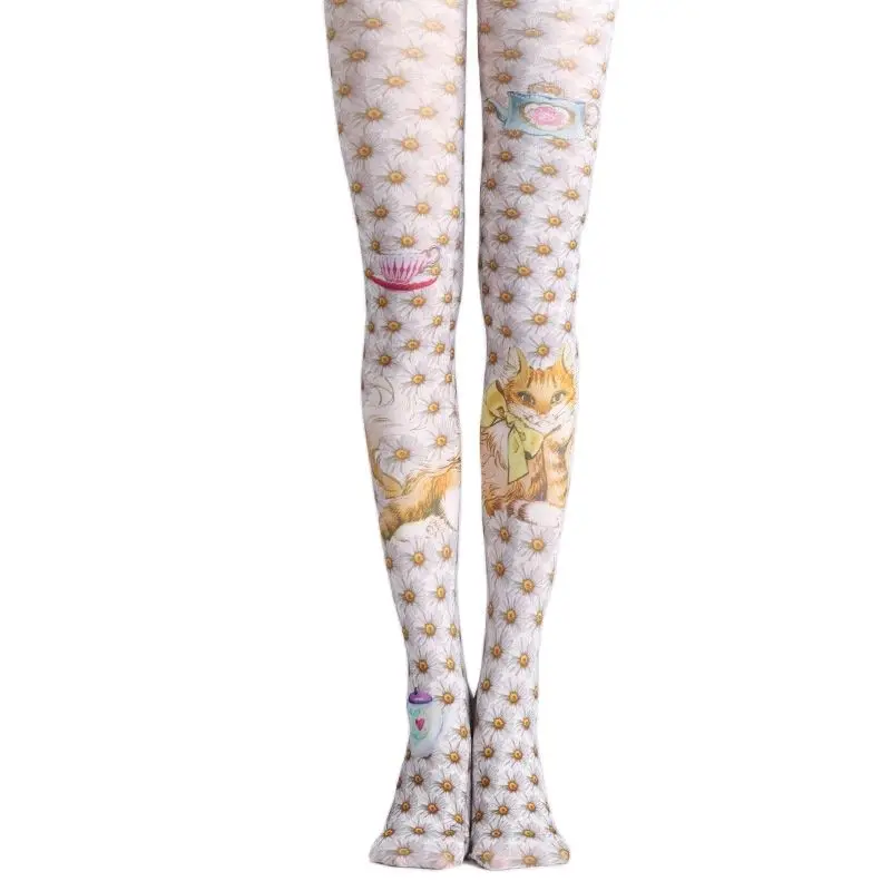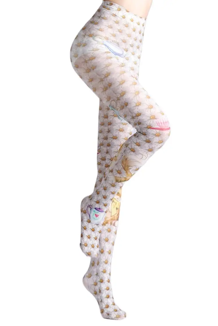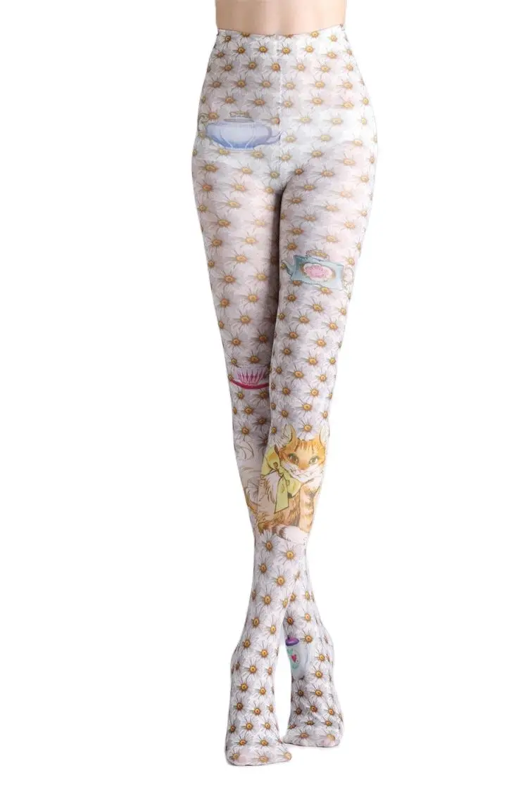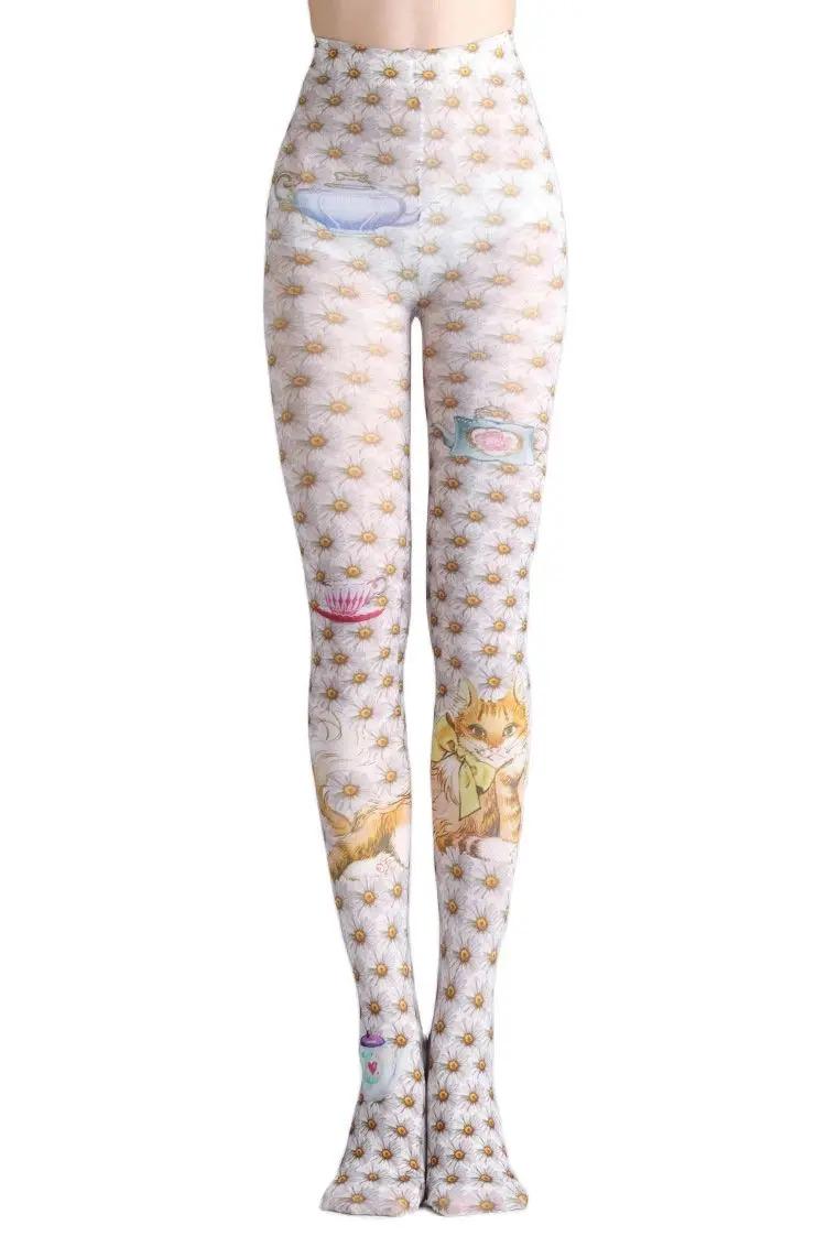 Women Tights with White Chrysanthemum Cat Afternoon Tea Cute Teapot Print Female Lingerie Lolita Stockings Pantyhose Leggings