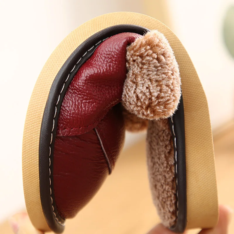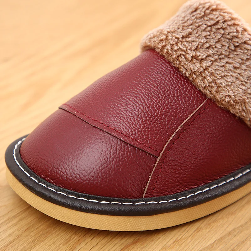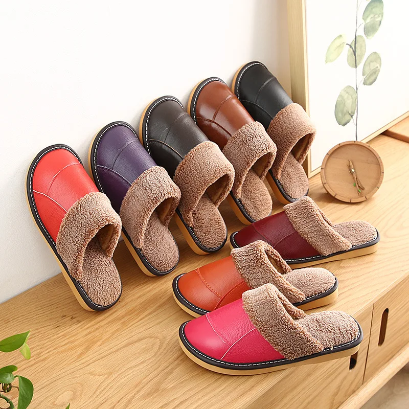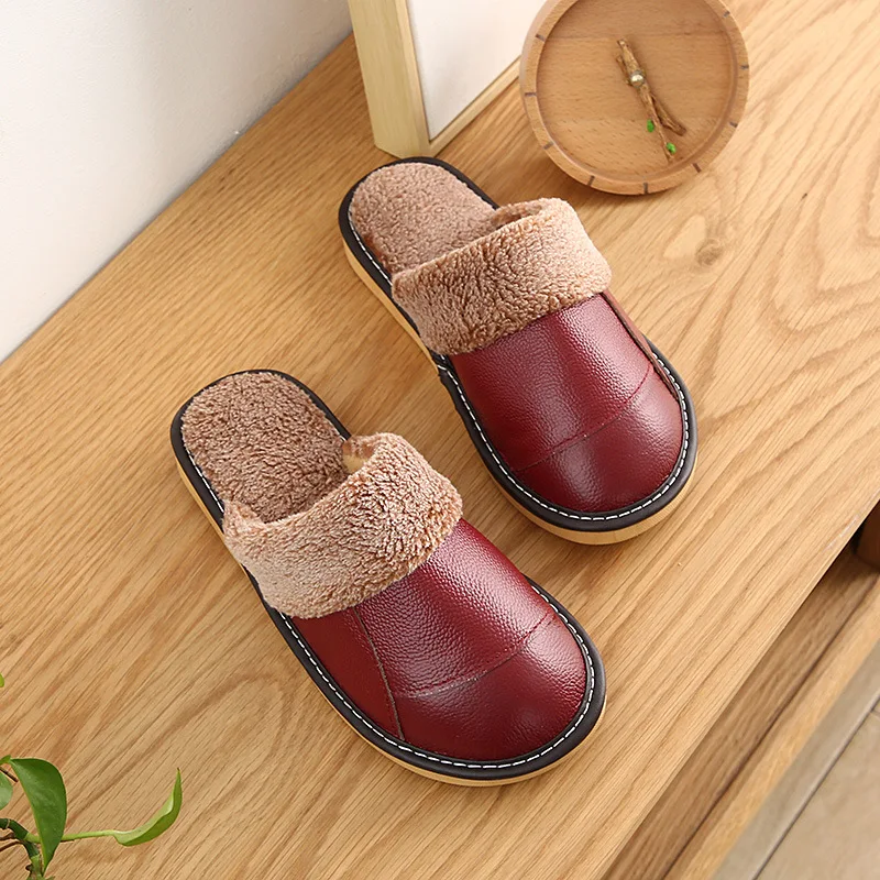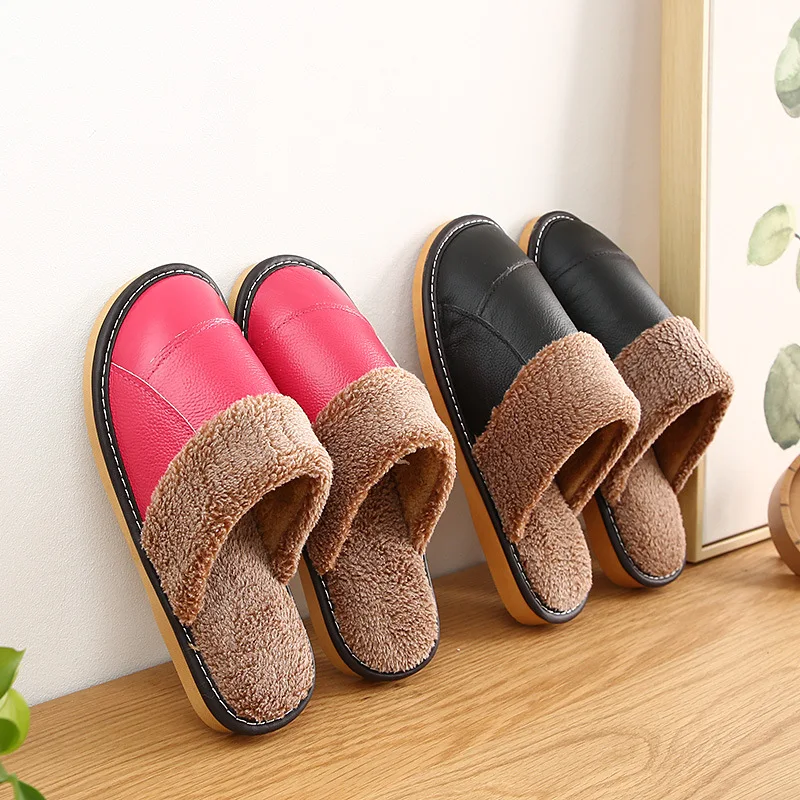 Women’s Winter Genuine Leather Home Slippers Anti-Slip Warm Couple’s Indoor Slippers Comfortable Home Shoes