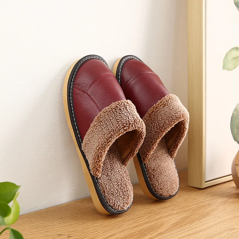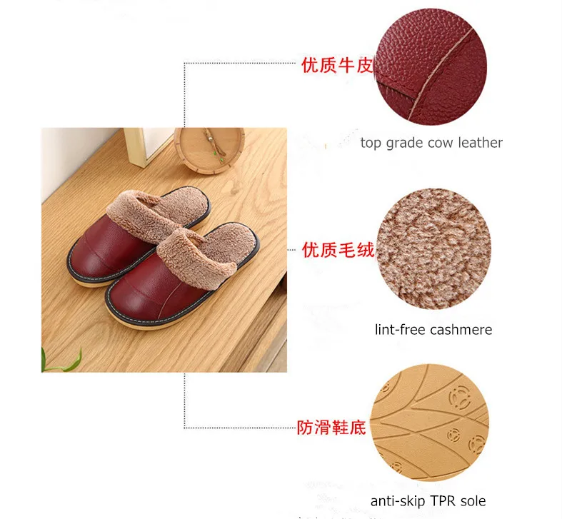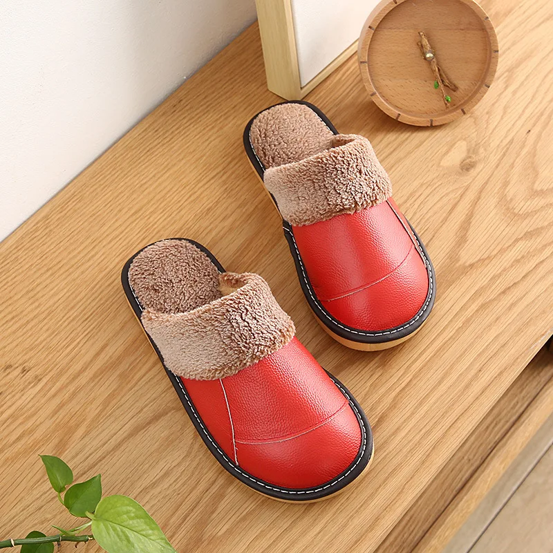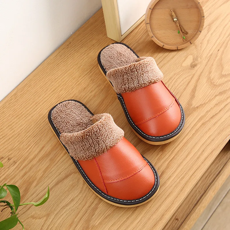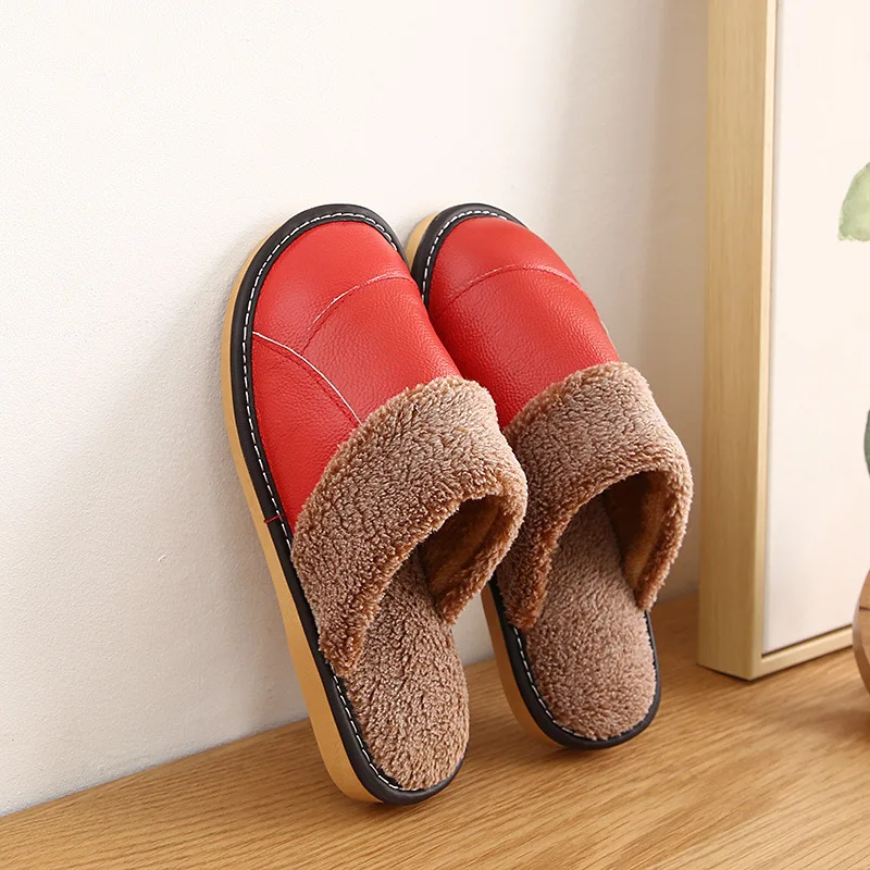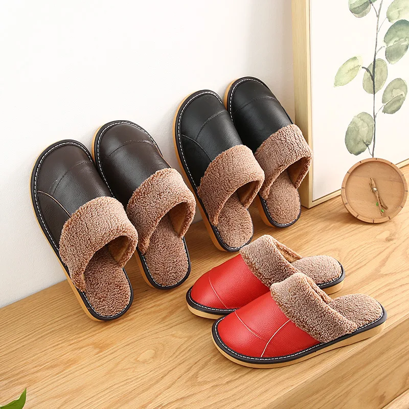 Women’s Winter Genuine Leather Home Slippers Anti-Slip Warm Couple’s Indoor Slippers Comfortable Home Shoes