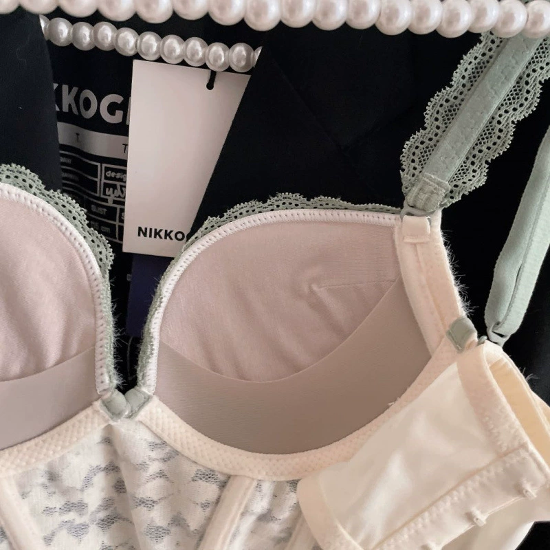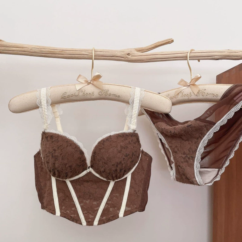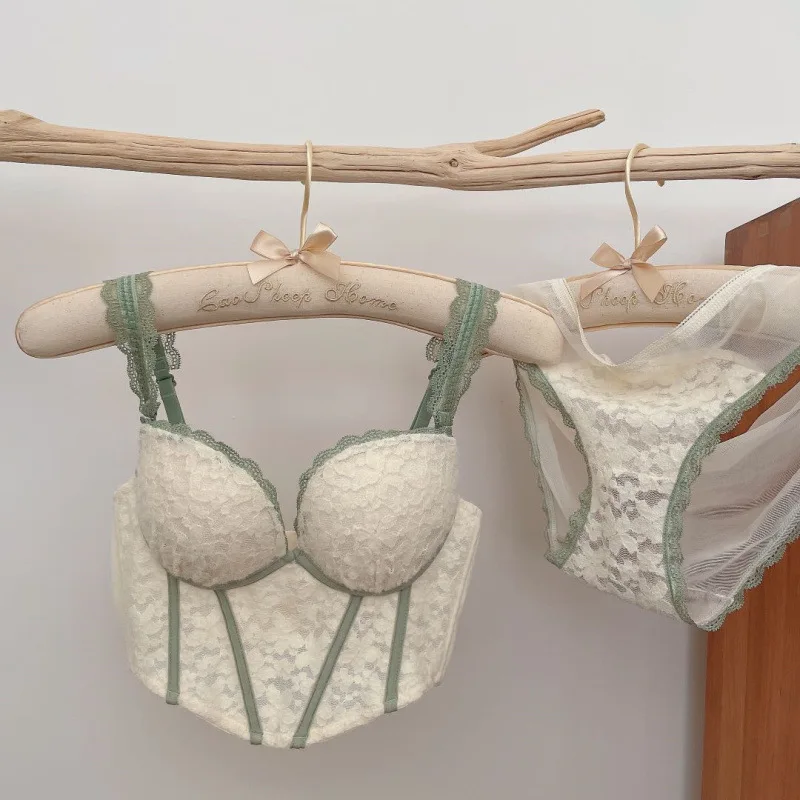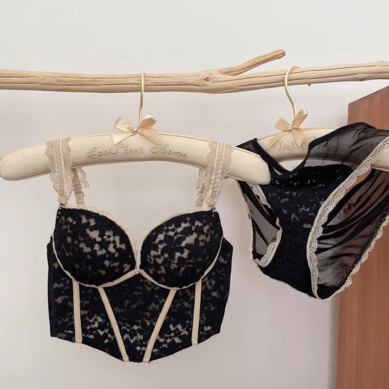 Wriufred Lace thick cup gather bra underpants set ladies deep v underwear set sexy women bralette lingerie suit