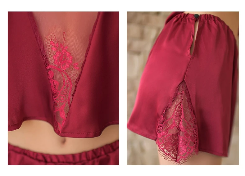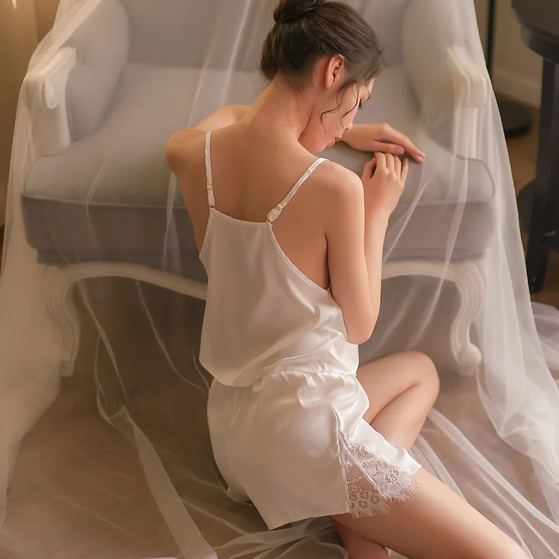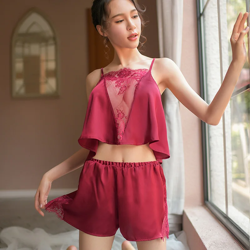 Yhotmeng sexy temptation pajamas female split thin section micro-transparent ice silk lace pajamas set