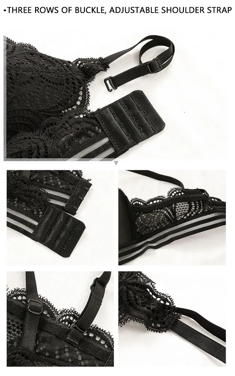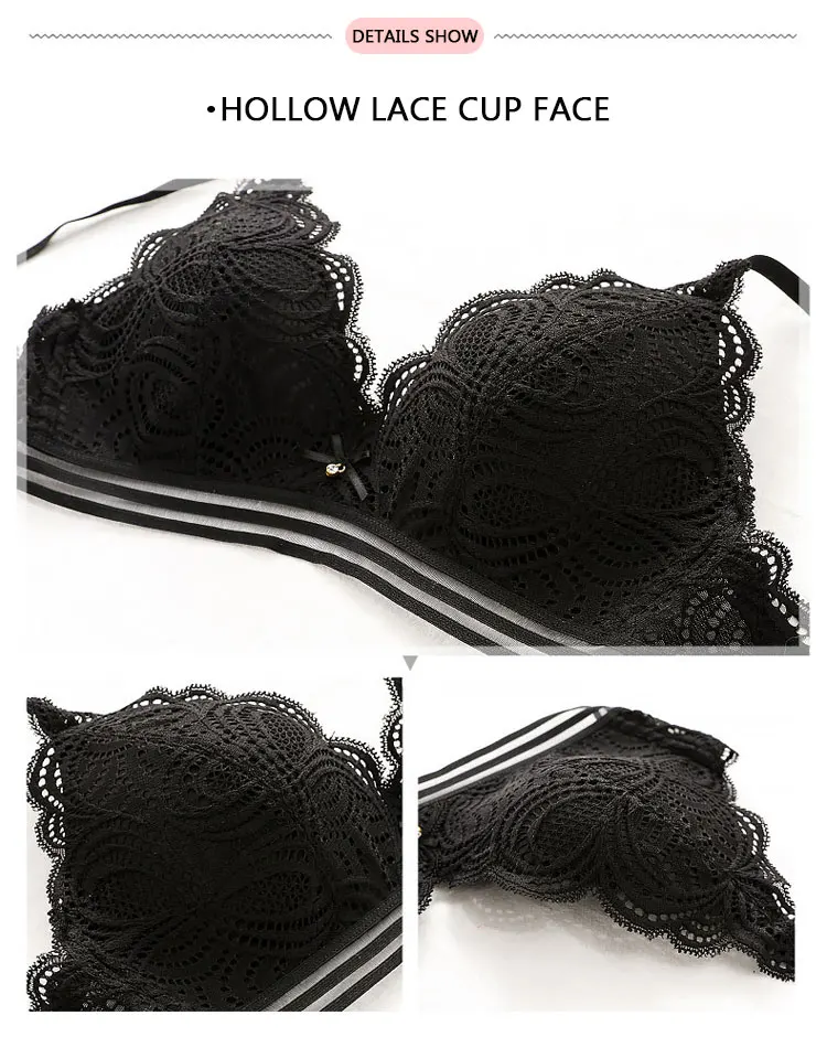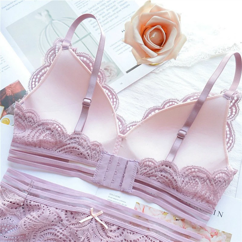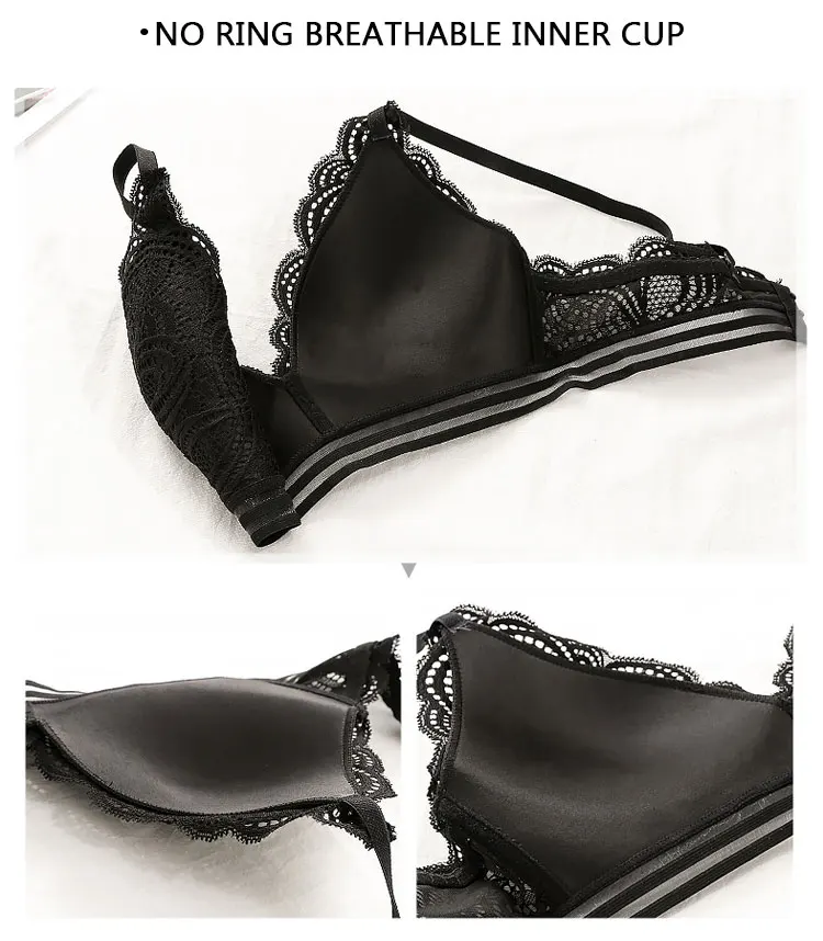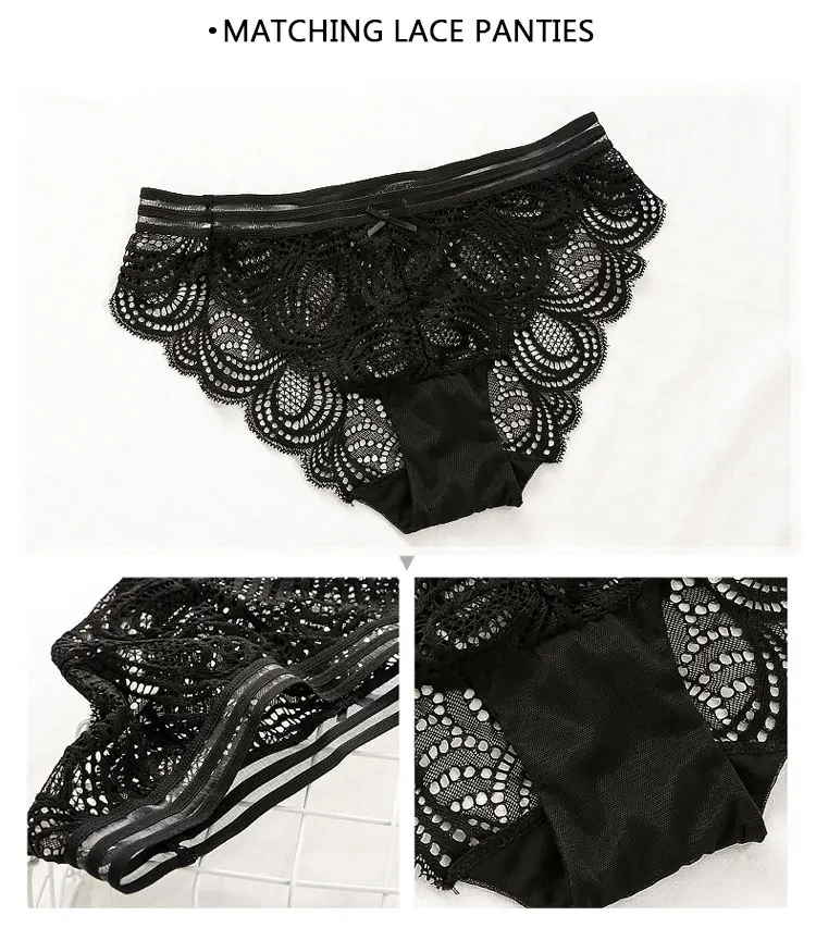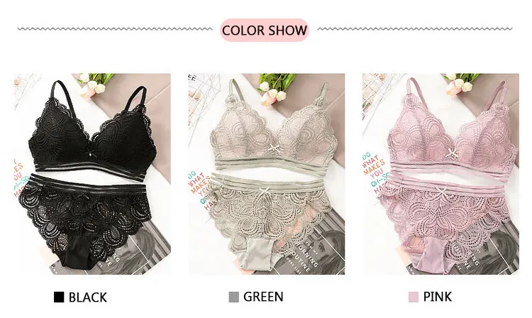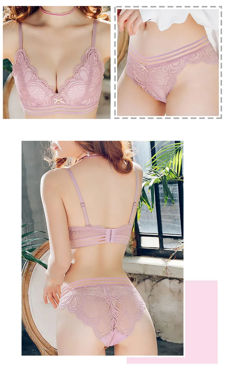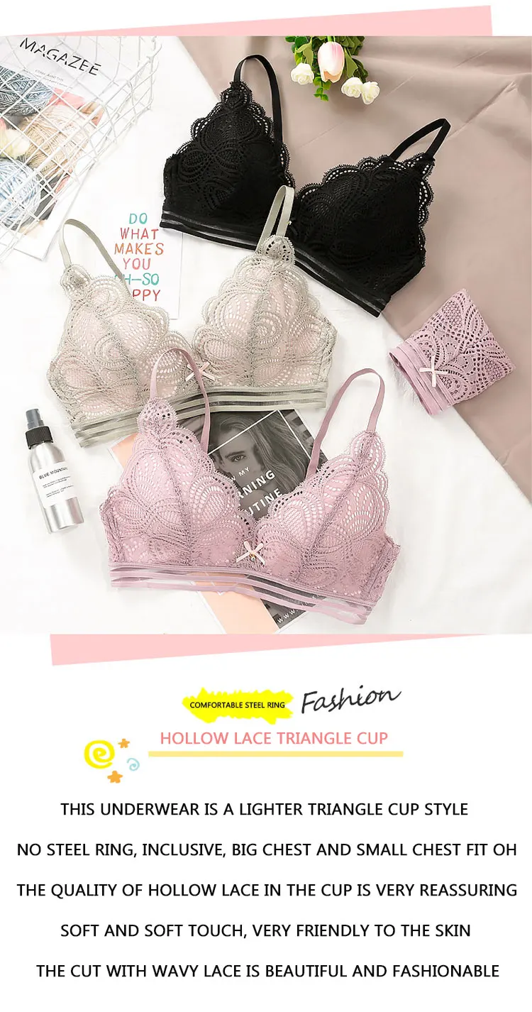 Yhotmeng thin lace lingerie push up bra set half transparent bra and panty set sexy triangle cup wireless underwear women